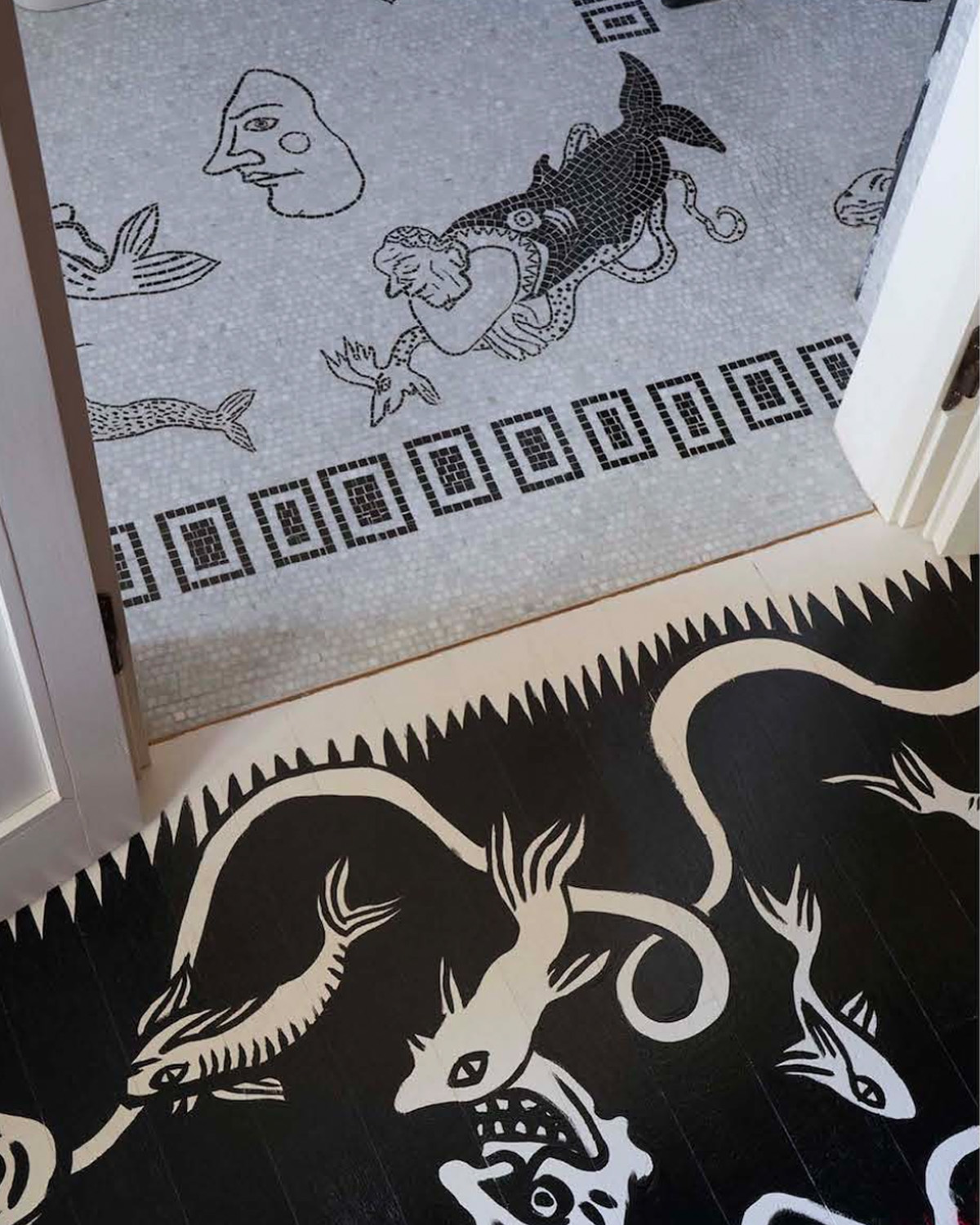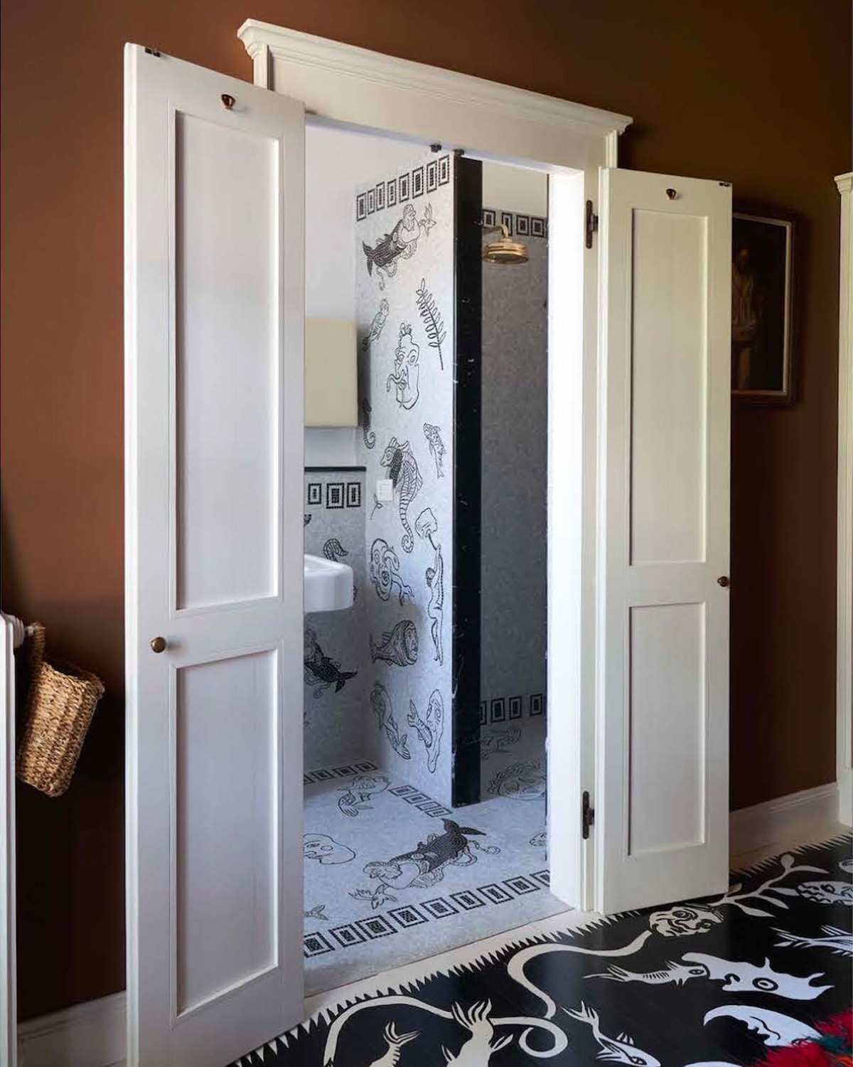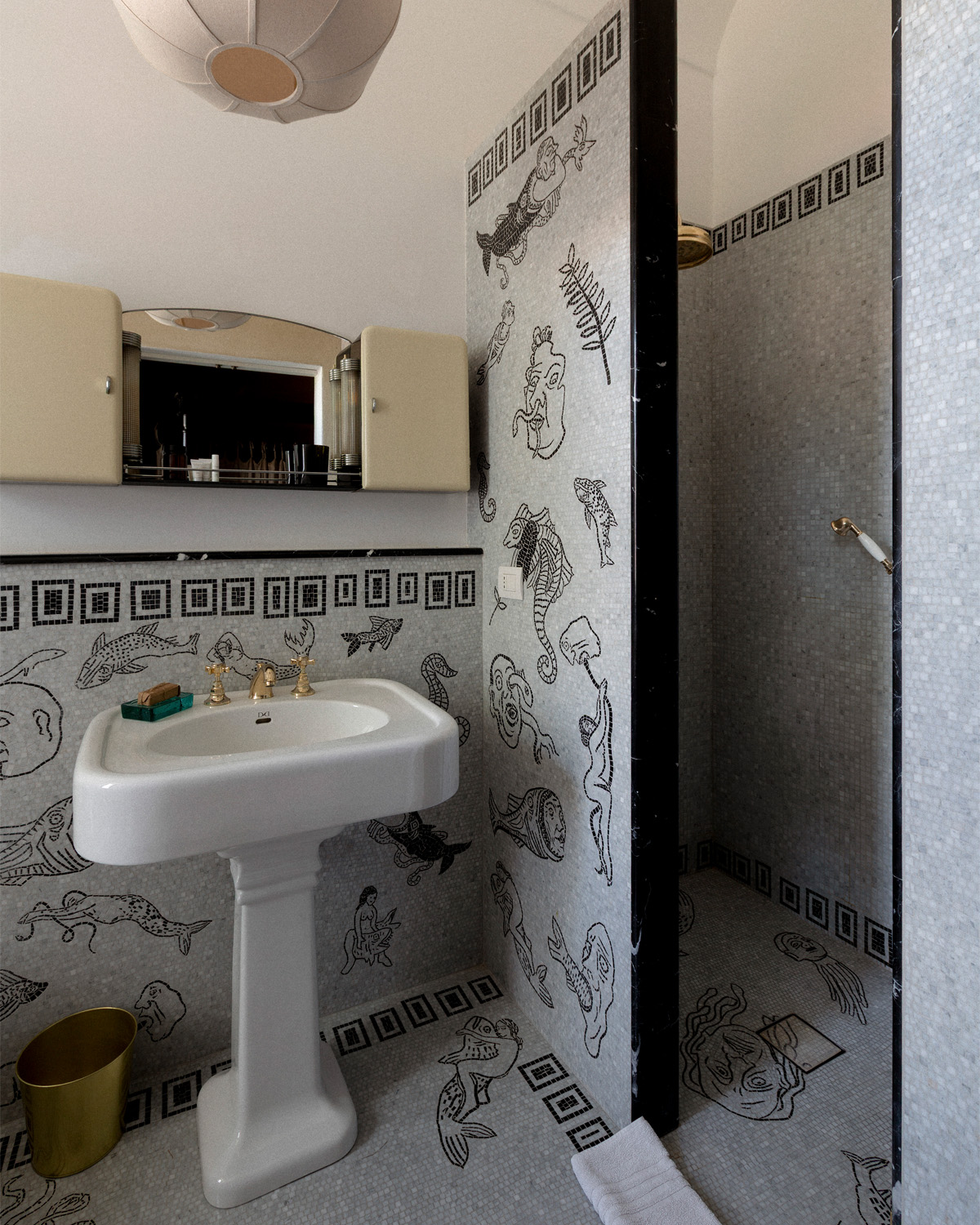 Decorated in a dark tabacco, the room’s accent comes from the hand painted floor. The ensuit shower room has a detailed mosaic, a design inspired by fish people. The room has a walk in wardrobe and views of the terrace outside.