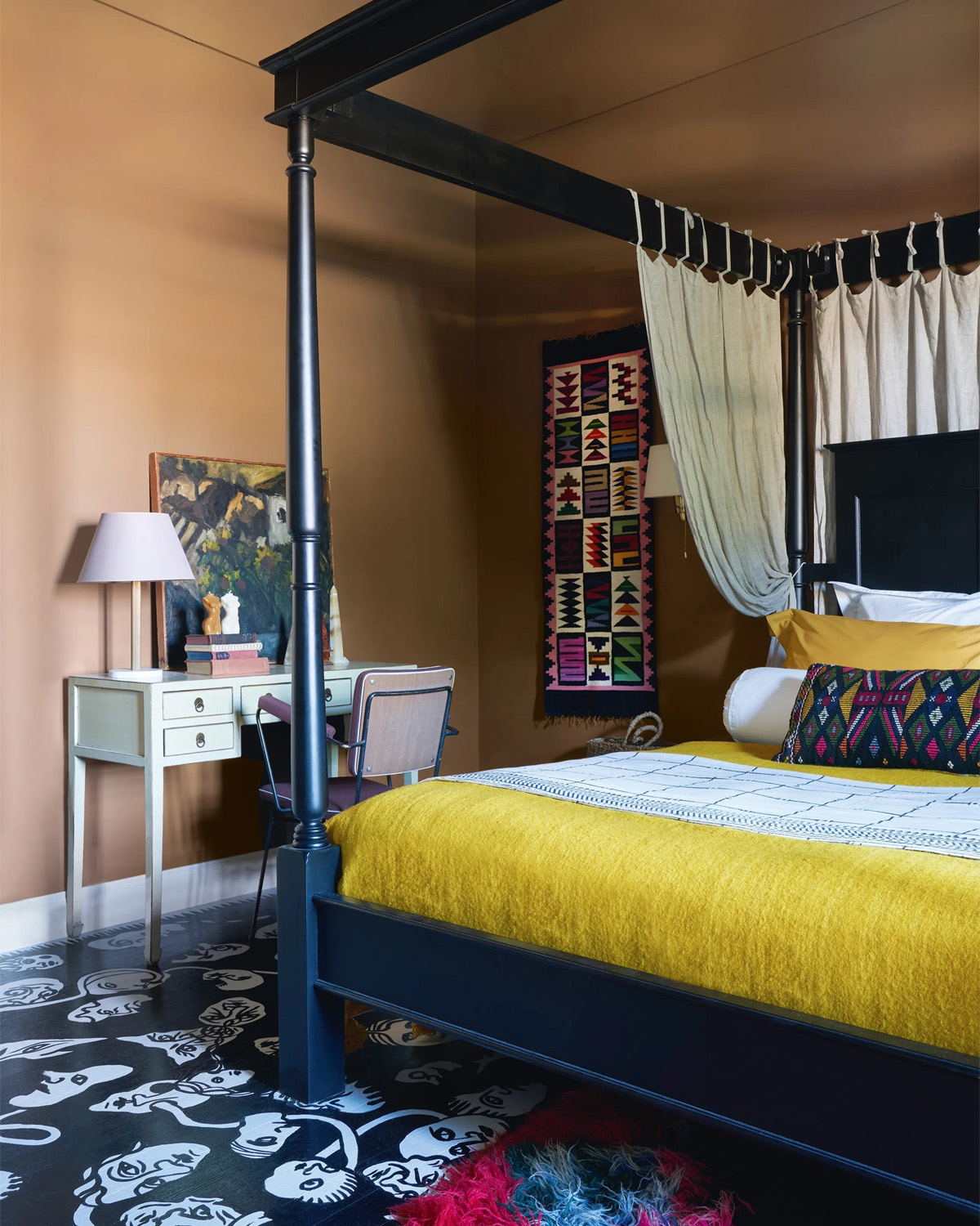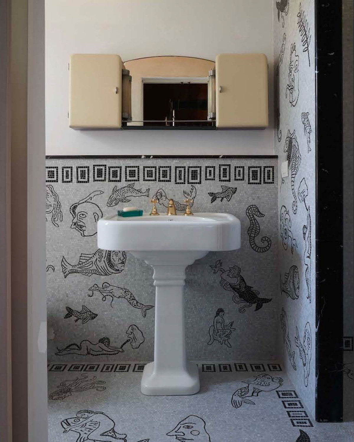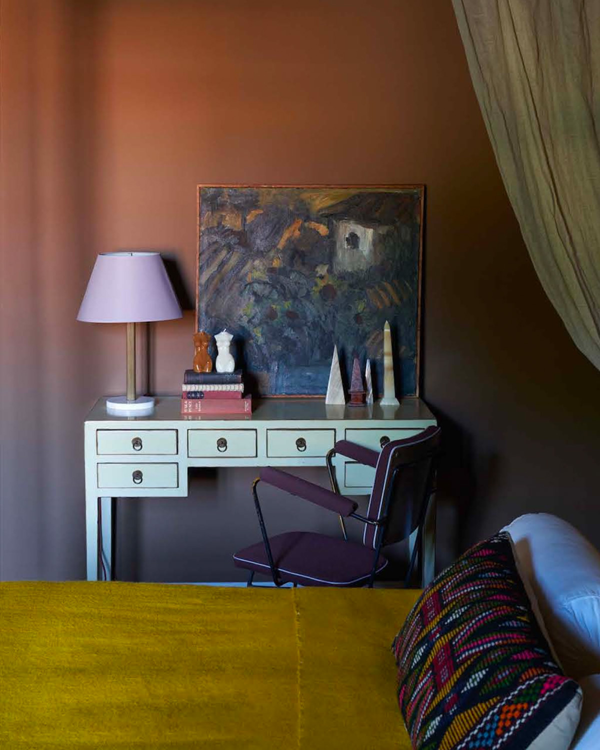 Decorated in a dark tabacco, the room’s accent comes from the hand painted floor. The ensuit shower room has a detailed mosaic, a design inspired by fish people. The room has a walk in wardrobe and views of the terrace outside.